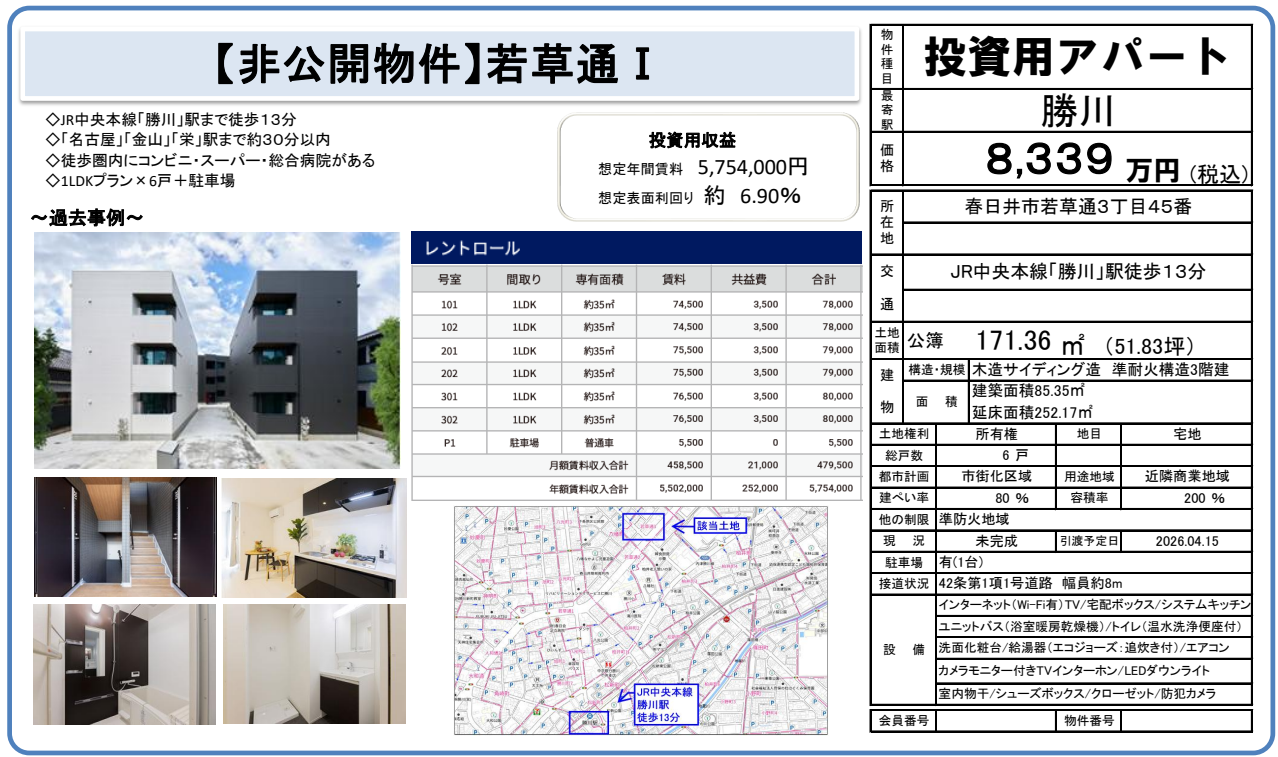 「勝川」駅まで徒歩約13分 徒歩圏内にコンビニが2軒あり、日用品や食材の急な買い出しにも便利な立地です 自転車圏内に市役所があり、引越しやその他手続きにも便利です 徒歩圏内に内科と歯科があり、専門的な受診も安心できます