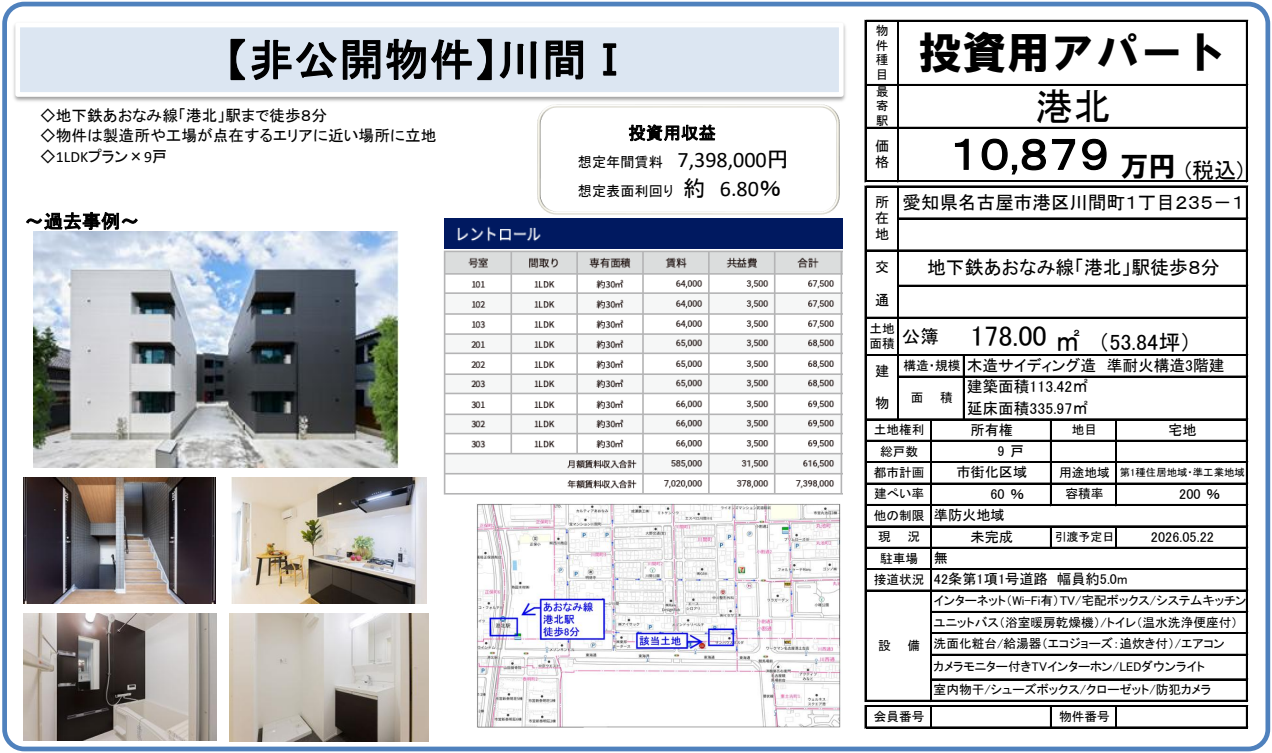 •「名古屋」「金山」「栄」各主要駅まで30分以内で行くことができ、交通利便性が高い立地と言える。 •港北駅より徒歩約3分、物件より徒歩約12分の場所に、21時まで営業しているスーバー 「ピアゴ」があるので、食品の調達がしやすい。 •物件より徒歩約3分以内に、コンピニエンスストア 「ローソン」があるので、急な買い出しにも対応できる。 •物件は製造所や工場が点在するエリアに近い場所に立地。そのため、車身就労者の入居が見込める。