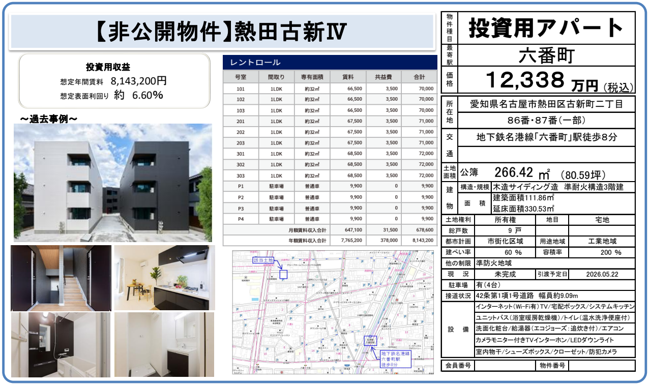◼「名古屋」「金山」「栄」各主要駅までは約15分以内で到着できるので、交通利便性が整った立地と言える。 ◼ 徒歩約9分圏内にスーパーマーケット、徒歩約4分圏内にドラッグストアがあるので、食料品・日用品の買い物にも便利。 ◼ 徒歩約4分圏内に、コンビニエンスストアがあるため、深夜の急な買い出しにも対応可能。 ◼ 徒歩約6分圏内にクリニック、徒歩8分圏内に歯科医院がある。さらに、自転車で約6分圏内に総合病院もあるので、体調不良やケガ等の際にも病院探しに困らない。 ◼ 自転車で約17分の場所に熱田区役所があり、引っ越しなどの手続き関連の際も便利。 ◼ 工場や物流センターが多く並ぶ名古屋市港区にほど近いこともあり、単身者の入居を見込むことができる。