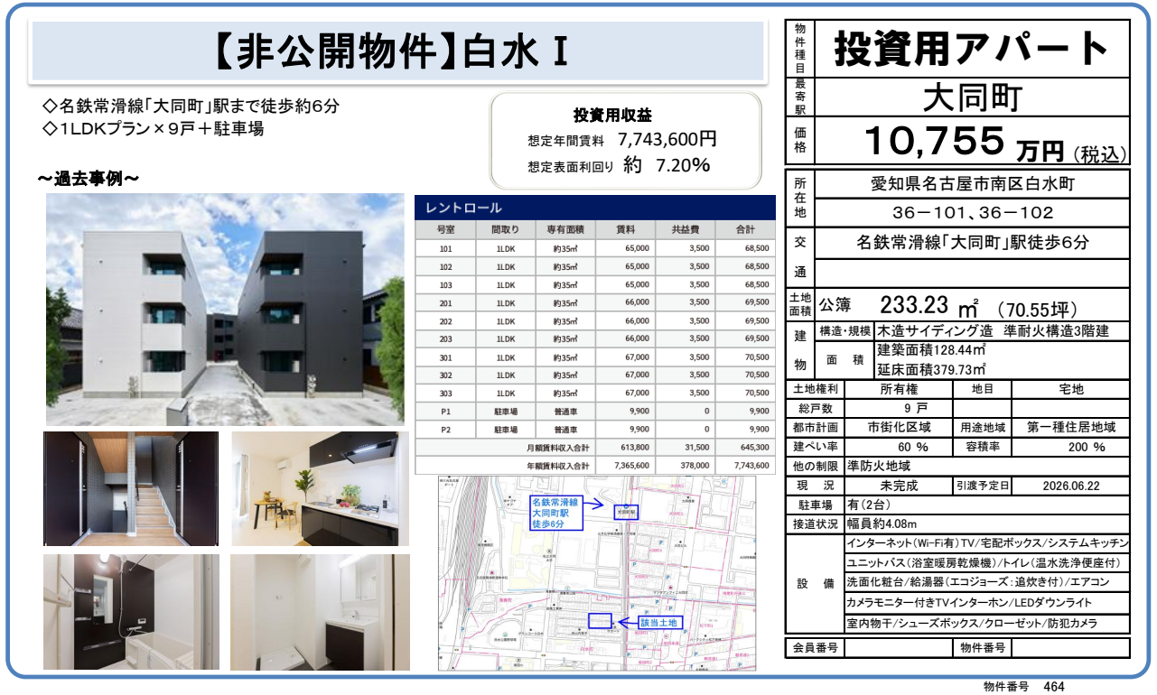 ◼「名古屋」「金山」「栄」各主要駅までは約30分以内で到着できるので、交通利便性が整った立地と言える。 ◼ 徒歩で約7分圏内にコンビニエンスストアが2軒あり、深夜の買い物などにも便利。 ◼ 徒歩約3分圏内にスーパーマーケット、徒歩約10分圏内にドラッグストアがあるため、車を持っていない入居者でも日用品の購入が気軽にできる。 ◼ 自転車で約4分圏内に、総合病院があるため、健康面でも安心して生活ができる環境が整っている。 ◼ 徒歩約7分圏内に大同大学があり、大学生の入居が見込める。 ◼ 自転車で約15分圏内に、三菱重工業名古屋航空宇宙システム製作所大江工場や大同特殊鋼星崎工場、東亞合成名古屋工場等、複数の大手企業の拠点があるので、独身者の入居も見込める。
